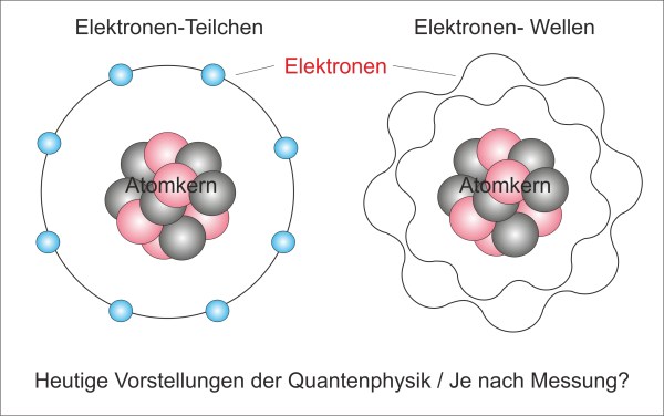 Anlรคsslich seiner Nobelpreisverleihung im Jahr 1922 meinte der Physiker Niels Bohr, das Atom sei einem Planetensystem รคhnlich. Diese Vorstellung eines zentralen Atomkerns mit einer Elektronenhรผlle ist bis heute erhalten geblieben. Die Vorstellung, dass die Elektronen um den Atomkern kreisen, erwies sich jedoch bald als Irrtum. Mit Beginn der Quantenphysik um 1925 wurde auch der Welle-Teilchen-Dualismus postuliert, demzufolge Elektronen sowohl Teilchen als auch Wellen sind. Die รberlegung war: Wenn ein elektrisch negatives Elektron auch eine Welle sein kann, kann es nicht in den elektrisch positiv geladenen Kern stรผrzen.