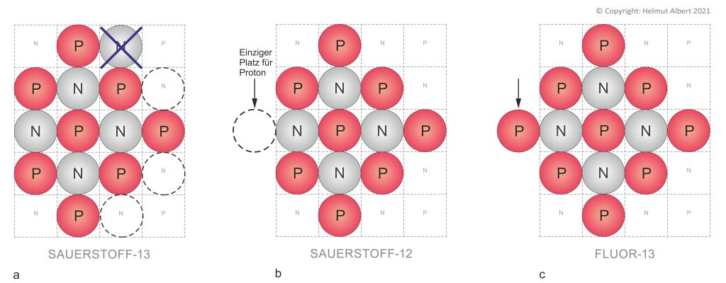 Sauerstoff verfügt nach offiziellen Angaben über insgesamt fünfzehn Isotope, davon sind drei natürlich. Das leichteste Sauerstoff-Isotop ist danach O-12(Sauerstoff 2021). Oben haben wir bereits den Aufbau des natürlichen Isotops O-16 nach dem schachbrettartig-planaren Atomaufbau sehen können. Gehen wir nun ebenso vor, wie die Forscher bei ihrem Experiment. Ausgangspunkt waren dabei die leichten Sauerstoff-Atome. Betrachten wir das Isotop O-13 in der Abbildung 2a. Der schachbrettartige Atomaufbau zeigt, von den Neutronen des Atoms O-13 kann nur noch ein einziges Neutron entnommen werden (Kreuzchen), ohne das Atom sprengen. Entfernen wir dieses Neutron, haben wir O-12 vorliegen, wie es in Abbildung 2b zu sehen ist. In diesem Zustand des Isotops O-12 können Neutronen zwar hinzugefügt werden, es können aber keine mehr entnommen werden. Auch dieser Atomaufbau ist wegen des Protonen-Überschusses instabil. Um Fluor-13 herzustellen muss O-12 noch ein Proton hinzugefügt werden. Der einzig noch mögliche Platz um ein Proton hinzuzufügen ist in Abb. 2b, mit einem gestrichelten Kreis gekennzeichnet. Dieser Bausteinplatz ist außerhalb des natürlichen Atomaufbaus (Siehe Atomaufbau Abb. 1a, 1b). Nachdem das Proton hinzugefügt wurde sehen wir Fluor-13, als quadratisch-planar aufgebautes Atom (Abb. 2c). Es ist klar, dass Fluor-13 aufgrund des hohen Protonen-Überschusses nur sehr kurzzeitig existieren kann. Anhand dieser künstlichen Protonen-Neutronen-Konfiguration wird ebenfalls deutlich, dass kein leichteres Fluor-Isotop als F-13 möglich ist, da kein weiteres Neutron entnommen werden kann. Das gleiche gilt für Sauerstoff-12; auch bei diesem Isotop ist kein leichteres Isotop mehr möglich. Siehe Abb. 2b.
