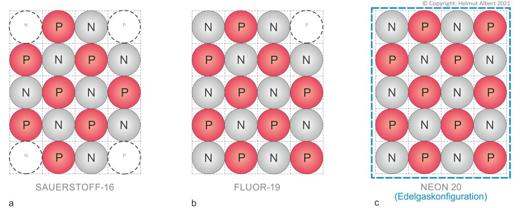 Verfolgen wir nun das o.g. Experiment indem wir es auf Grundlage des schachbrettartigen Atomaufbaus nachvollziehen. Der planare Atomaufbau beginnt mit dem Helium-Atom das bereits mit 2×2 Atombausteinen ein geschlossenes Atomrechteck bildet und deshalb über die Edelgaskonfiguration verfügt. Das nächste Edelgas-Atom, Neon-20, stellt mit 4×5 Bausteinen ebenfalls ein geschlossenes Atomrechteck dar. Entfernen wir an einem Eck dieser Konfiguration ein Proton dann haben wir Fluor-19 vorliegen. Um von da aus zu Sauerstoff-16 zu gelangen müssen wir noch ein Proton und zwei Neutronen an den Ecken des Atoms entfernen. (siehe Abb. 1a, b, c).
