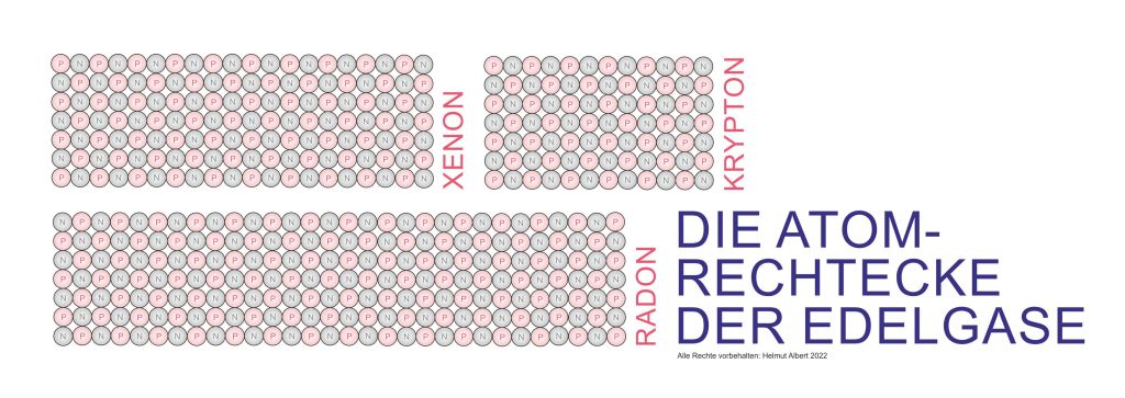 Die Atomrechtecke der Edelgase des PSE, bilden eine Art „Meilensteine“, nach ihnen beginnt immer wieder eine neue Periode. Warum ist das so? Mit der Vervollständigung eines Atomrechtecks durch Protonen und Neutronen wird die Edelgaskonfiguration erreicht. Die äußeren Bausteinreihen sind dann vollständig gefüllt, sodass kein Nukleon mehr aufgenommen kann. Das ist der Grund dafür warum Edelgase die Wertigkeit „Null“ aufweisen. Sie sind nicht reaktiv im Gegensatz zu Atomrechtecken die noch über unbesetzte Bausteinplätze verfügen. Das wird schon beim ersten Edelgas des PSE deutlich. Mit 2 x 2 Atombausteinen bildet Helium das erste geschlossene Atomrechteck. Alle anderen Edelgase bis zu Oganesson sind ebenfalls geschlossene Atomrechtecke und nicht reaktiv. Der Aufbau der schweren Atome, wie auch der Edelgase, ab der 4. Periode, erfolgt in Siebenerreihen, die bis zum kurzlebigen Element Oganesson langgezogene Atomrechtecke bilden. Mit Oganesson dessen Atommasse 294 Nukleonen aufweist, ist das Ende des Atomaufbaus erreicht.