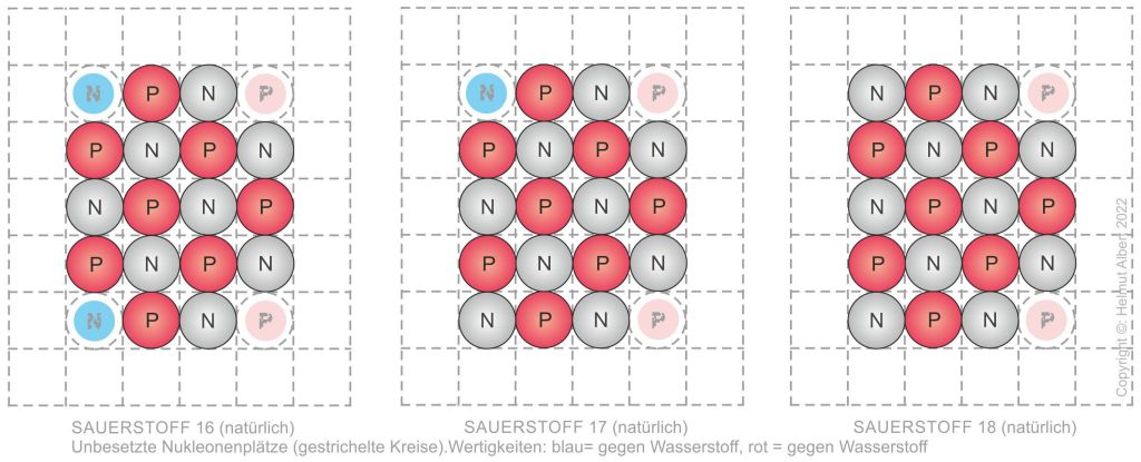 Je nach Besetzung der Sauerstoff-Atome ändern sich auch die Wertigkeiten (in der Abbildung mit rot und blau markiert). Beim Sauerstoff-Isotop O17 ist nur ein Eckplatz mit einem Neutron besetzt. Damit verfügt dieses Isotop über eine Wertigkeit gegen Sauerstoff weniger, als O16. Beim Sauerstoff-Isotop O18 ist auch der zweite bei O17 noch unbesetzte Neutronenplatz, besetzt. Damit verfügt O18 über keine Wertigkeit gegen Sauerstoff. Eine weitere Besetzung mit Neutronen ist bei O18 nur noch synthetisch möglich und führt zur Instabilität des Sauerstoff-Isotops.