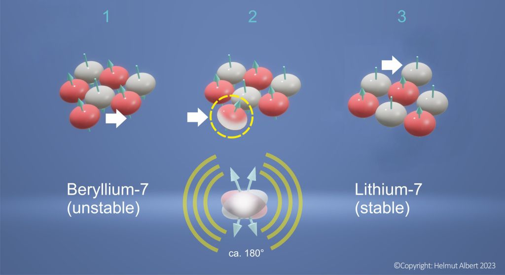 Auf Grundlage des schachbrettartigen planaren Atombaus ist dieser Vorgang jedoch ganz anders zu interpretieren. Danach verwandelt sich beim Zerfall des Isotops Beryllium-7 ein Proton in ein Neutron, indem ein Proton um fast 180° zu schwingen beginnt, bis seine Rotationsachse allmählich zur Ruhe kommt. Der Spin des Atombausteins hat sich von Spin up zu Spin down gewandelt, aus dem Proton ist ein Neutron mit retrograder Rotationsrichtung geworden.