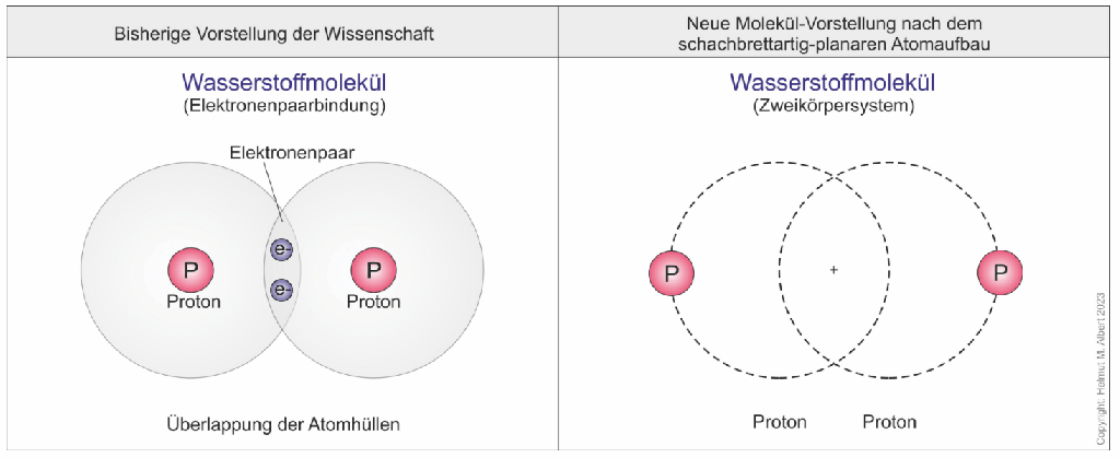 Ebenso wie Erde und Mond ist ein Wasserstoffmolekül ein Zweikörpersystem, mit dem Unterschied, dass beim Wassermolekül, Grösse und Masse der beiden Körper völlig gleich sind. Für das „Funktionieren“ eines Wasserstoffmoleküls sind weder sog. „Elektronen“ noch andere Teilchen notwendig.