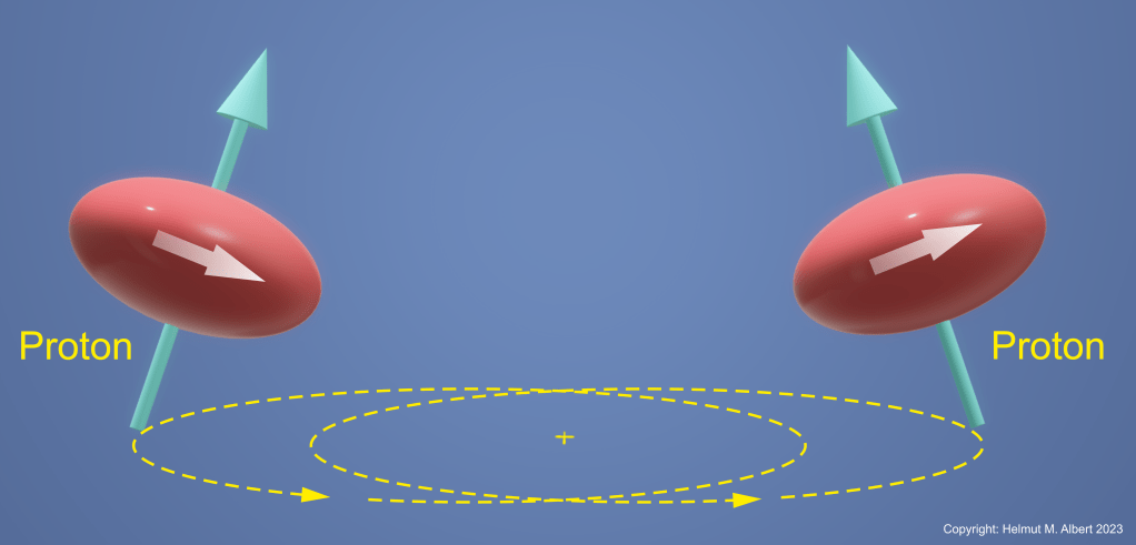 Beim Zusammenstoß zweier Protonen stoßen sich die Protonen gegenseitig ab. Die Krafteinwirkung auf die schnell rotierenden Protonen führt zu einer Ausgleichsbewegung in Form einer Bahnbewegung um das jeweils andere Proton. Die beiden Protonen umkreisen sich gegenseitig. Dadurch werden die beiden Atome dauerhaft aneinander gebunden. Vergleichbar mit schnell rotierenden Kreiseln, die man durch Anstoßen zu einer Bahnbewegung zwingt. Diese gegenseitige Umkreisung zweier Protonen bzw. Wasserstoffatome bewirkt die Bindung zu einem Wasserstoffmolekül(vgl. Albert H. Albert G. 2017).