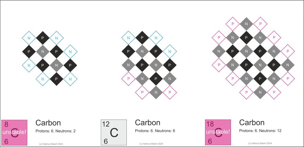 Am Beispiel eines Kohlenstoffatoms kann gezeigt werden, wie die genaue Bestimmung der Massenzahl eines Kohlenstoffatoms möglich ist. Bisher ging die Wissenschaft davon aus, dass das schwerste Isotop „Kohlenstoff-23“ und das leichteste „Kohlenstoff-8“ ist(vgl. Kohlenstoff 2023). Während die Bestimmung des C-8-Isotops die tatsächliche Massezahl des leichtesten Kohlenstoff-Isotops widerspiegelt, ist die Annahme der Isotope C-22 oder C-23 außerhalb der Realität. Das tatsächlich größte Isotop des Kohlenstoffs ist Kohlenstoff-18(Siehe Abbildung). Aufgrund der hier gezeigten schachbrettartigen Kerntruktur wird dabei deutlich, warum das leichteste Kohlenstoff-Isotop C-8 und das schwerste C-18 ist und warum es keine schweren C-22 oder C-23-Isotope geben kann(Zur besseren Verdeutlichung sind die runden Nukleonen als Quadrate dargestellt). Mit der Theorie des schachbrettartig-planaren Atombaus ist zukünftig die genaue Bestimmung der Kohlenstoffisotope und aller anderen Isotope von Atomen möglich.