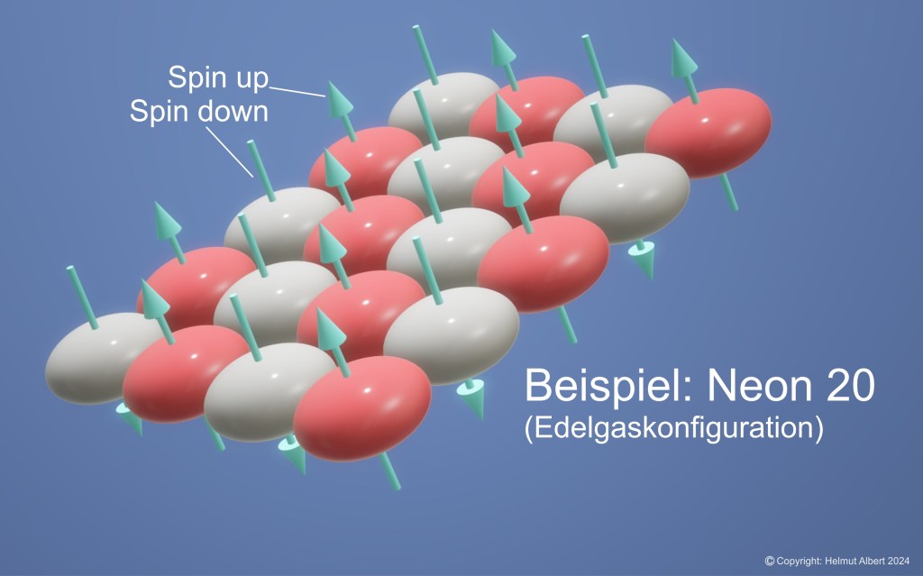 Betrachten wir nach dieser Theorie nun den Aufbau des Edelgases Neon-20 mit zehn Protonen und zehn Elektronen. Wie beim Sauerstoffatom befinden sich die ersten beiden Elektronen im 1s- und 2s-Orbital. Die restlichen sechs Elektronen verteilen sich auf die drei hantelförmigen 2p-Orbitale. Insgesamt also zehn Elektronen. Die Begründung für die Edelgaskonfiguration liegt nun darin, das 2s-Orbital und die drei hantelförmigen 2p-Orbitale als vereinigte Orbitale zu betrachten. Rein rechnerisch erhält man damit acht Elektronen, die eine Edelgaskonfiguration darstellen. Die willkürliche Konstruktion dieses Orbitalsystems ist jedoch offensichtlich.
