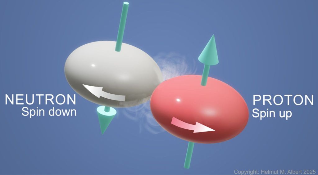 Aufgrund ihrer schnellen Rotation existieren Protonen und bilden den Ursprung des gesamten Universums. Neutronen hingegen stellen einen zweiten Zustand eines Protons dar. Sie weisen eine um etwa 180° gestürzte Achsenlage auf. Dies ist allerdings nur der Fall, solange sie mit einem oder mehreren Protonen an ihren Äquatoren direkt verbunden sind und Atome bilden.