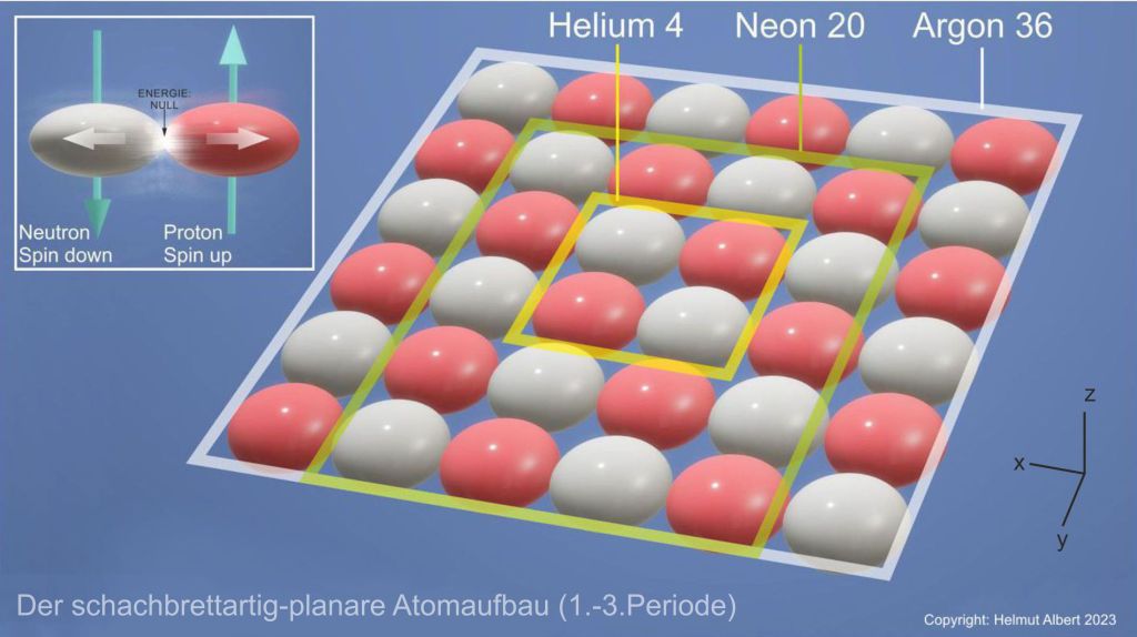 Dabei ist die Wirklichkeit gar nicht so schwer zu verstehen, denn die Informationen und Fakten zum Verständnis der tatsächlichen Teilchen und Kräfte liegen heute auf dem Tisch! Protonen sind schnell rotierende Teilchen. Durch Umkehrung ihrer Rotationsachsen bei Kollisionen können sie zu Neutronen werden. Ihre damit zu Protonen entgegengesetzte Rotation ermöglicht den Aufbau schachbrettartiger Atome, da sie so ihre Energien ausgleichen können. Die starke Kernkraft ist die Anziehungskraft zwischen Proton und Neutron aufgrund ihrer entgegengesetzten Rotation sowie ihre Abstoßungskraft aufgrund ihrer gleichen Rotation. Diese Erkenntnis macht die Theorie der Quantenchromodynamik und das Standardmodell der Teilchenphysik überflüssig. Doch bis dies von der Wissenschaft anerkannt wird, können noch Jahrzehnte vergehen.