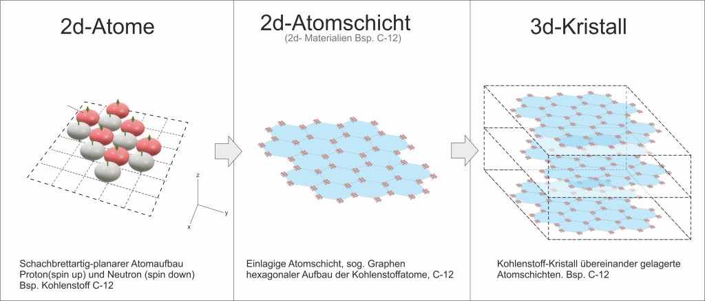 Ebenso wie einlagige Atomschichten – beispielsweise Kohlenstoff- oder Siliciumschichten – aus nur einer einzigen Lage Atome bestehen, sind Atome aus einer einzigen Schicht von Nukleonen aufgebaut. Dabei sind die Nukleonen abgeflachte Kugeln ähnlich, die natürlich ebenso dreidimensional sind wie ein Diskus. Die zweidimensional aufgebauten Atome bilden so zweidimensional aufgebaute Atomschichten, die übereinander gelagert dreidimensional aufgebaute Kristallgitter bilden. Die Atome bauen sich, wie im Periodensystem aufgelistet, schachbrettartig von unvollständigen zu vollständig geschlossenen Atomrechtecken auf. Jedes vollständig geschlossene Atomrechteck ist ein Edelgas.
