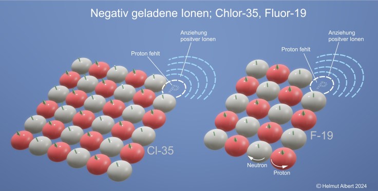 In diesen Beispielen fehlt jeweils ein Proton an einer Ecke des Atomrechtecks. Diese offene Position erzeugt ein Ungleichgewicht im mechanischen Kernsystem. Das Atom besitzt dadurch eine einzelne Andockstelle. Bei F-19 und Cl-35 entspricht dies einer Wertigkeit von 1 gegenüber Wasserstoff.