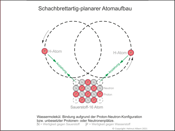 Abb. links: Schalenmodell d. Wassermoleküls. Abb. rechts: Schachbrettartig-planarer Atomaufbau d. Wassermoleküls. Helmut Albert 2023. Nach den bisherigen Vorstellungen der Wissenschaft sind die chemischen Bindungen der Atome von den Elektronen der Atomhülle abhängig. Wie schon vor mehr als 100 Jahren geht die Wissenschaft auch heute noch von der Vorstellung eines Elektronensystems in der Atomhülle aus. Daran... Continue Reading →