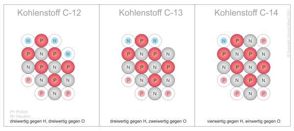 Mit dem schachbrettartig-planaren Atomaufbau sind alle Isotope eines Elements bezüglich ihrer Wertigkeit darstell- und berechenbar. Das Beispiel der natürlichen Kohlenstoffisotope zeigt in der Abbildung oben, was die Ursache einer Wertigkeit ist und wie die Wertigkeit bestimmt werden kann.